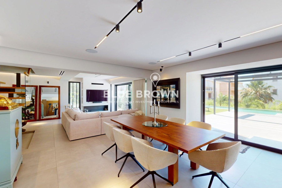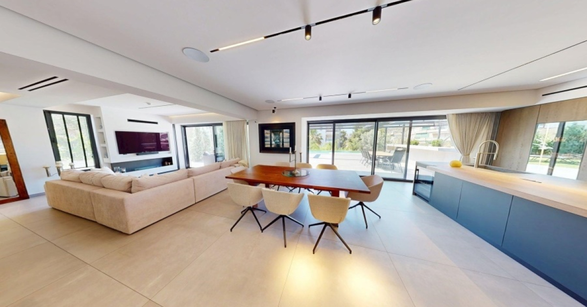 Κάτω Επίπεδο (είσοδος από ισόγειο λόγω επικλινές εδάφους – 154 τ.μ.) Αυτό το επίπεδο περιλαμβάνει έναν ευρύχωρο ενιαίο χώρο καθιστικού και τραπεζαρίας με μία κομψή, πλήρως εξοπλισμένη κουζίνα που ανοίγει απευθείας στον καταπράσινο ιδιωτικό κήπο και στη μεγάλη πισίνα (50 τ.μ.). Ο εξωτερικός χώρος διαθέτει ηλεκτρική πέργκολα, εξωτερική κουζίνα και BBQ – ιδανικός για φιλοξενία και χαλάρωση.