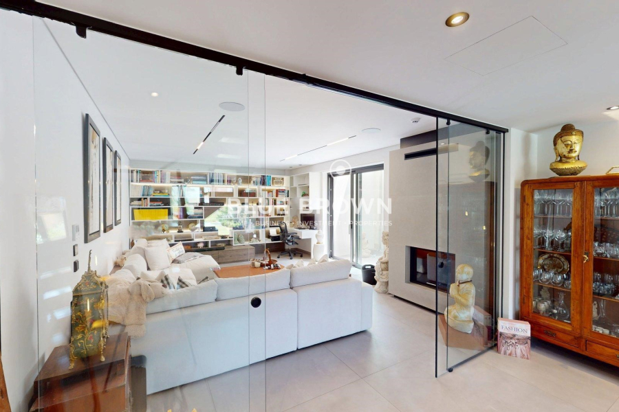 Ένα δεύτερο καθιστικό με ενεργειακό τζάκι ξύλου προσφέρει θέα σε έναν εντυπωσιακό διακοσμητικό καταρράκτη εξωτερικού χώρου, δημιουργώντας μια μοναδική αίσθηση χαλάρωσης και στυλ. Σε αυτό το επίπεδο βρίσκεται επίσης ένα άνετο υπνοδωμάτιο με δικό του μπάνιο (en-suite), ένα WC επισκεπτών και μία πρακτική γωνιά γραφείου.